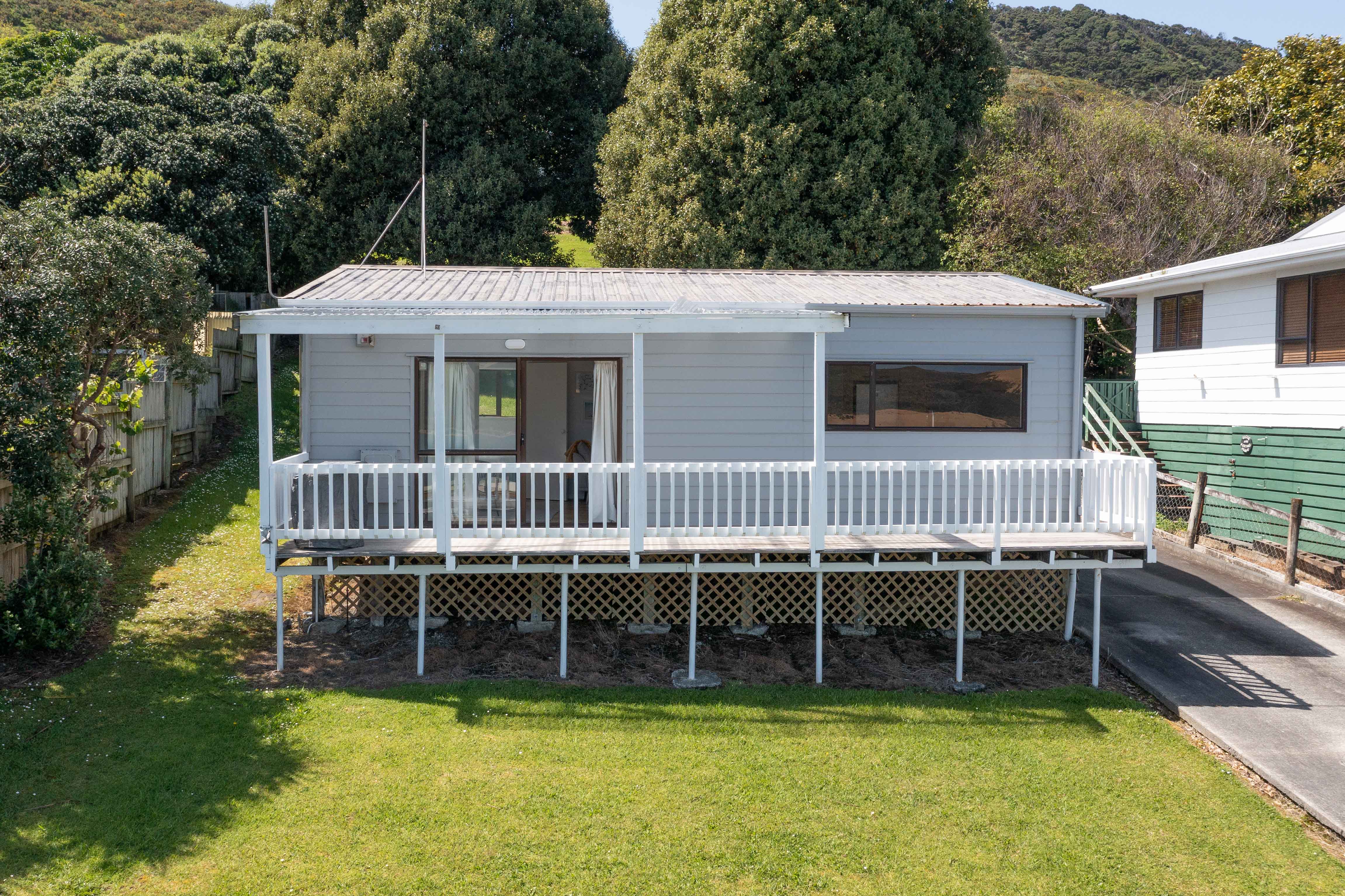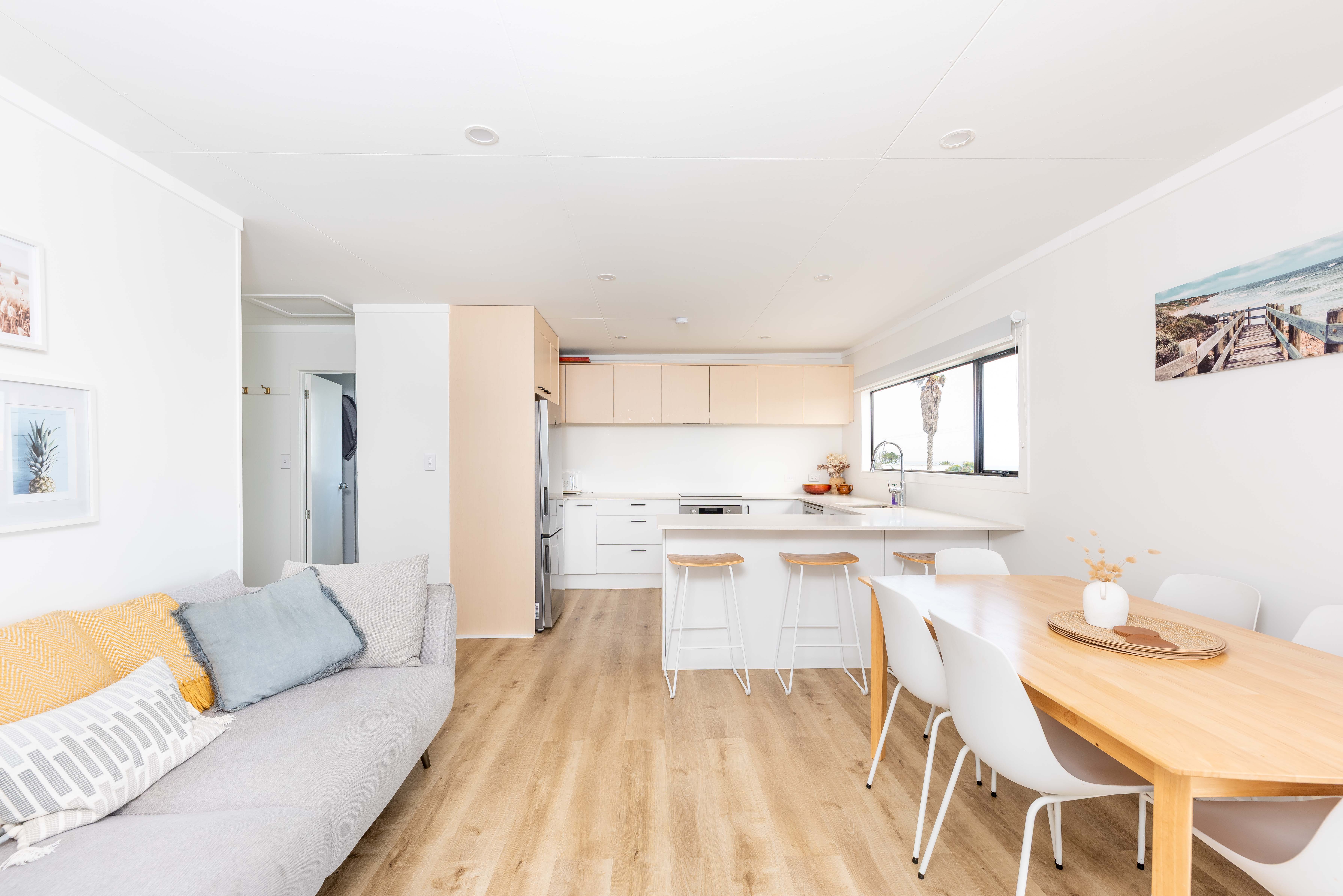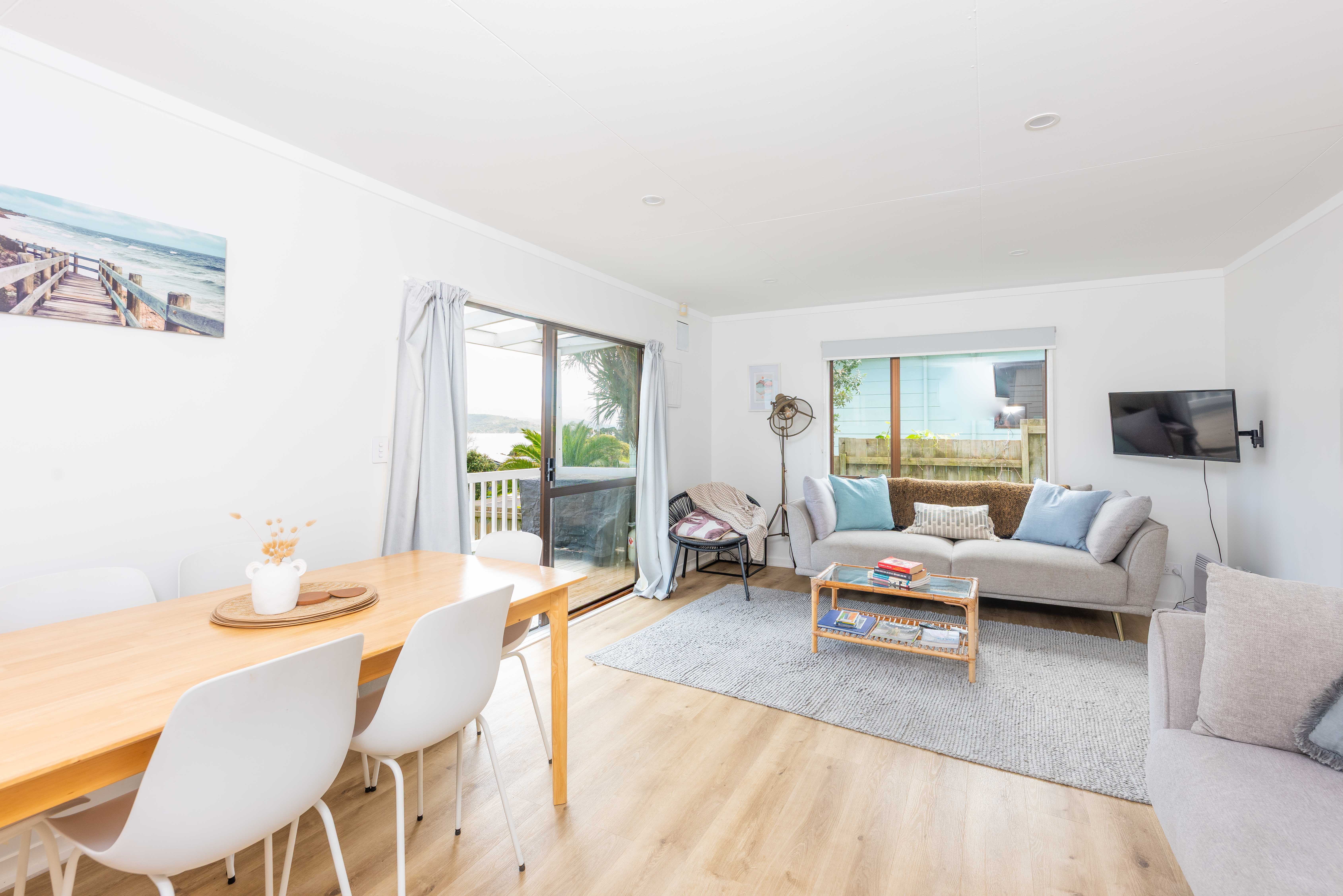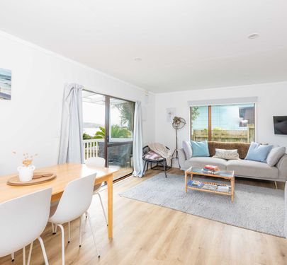 Featuring two light-filled bedrooms and an open-plan kitchen, dining and living area, the home flows seamlessly onto the front deck — the ideal spot to unwind, entertain, and take in those iconic West Coast sunsets.