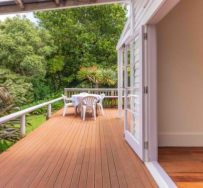 The heart of the home is the light-filled open-plan kitchen, dining, and living area, designed for relaxed everyday living. From here, doors open directly onto the expansive wrap-around deck—an ideal space for entertaining, unwinding, or simply taking in the lush garden surroundings. The main bedroom also features direct access to the deck, providing a seamless indoor–outdoor flow and a peaceful spot to start or end the day.