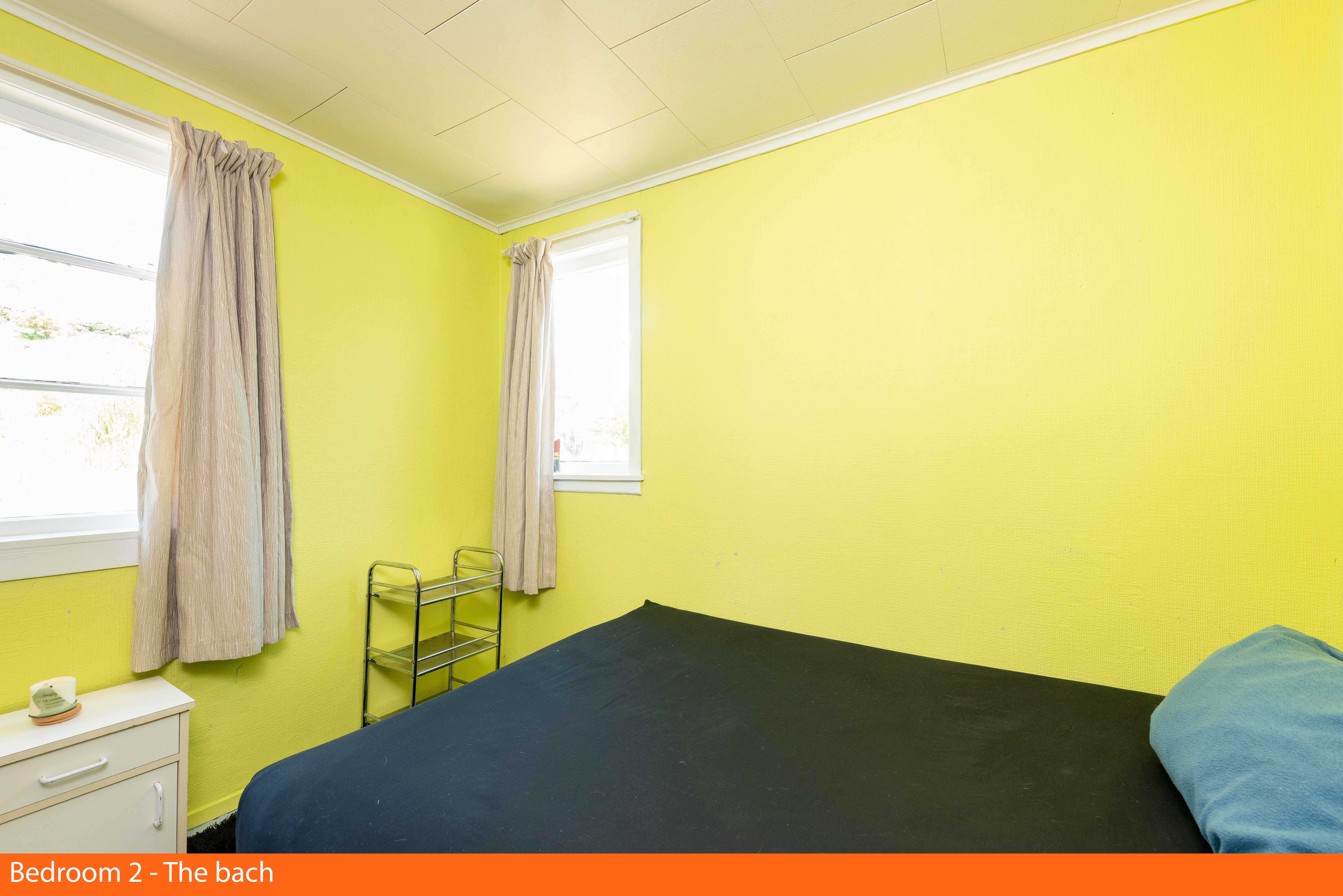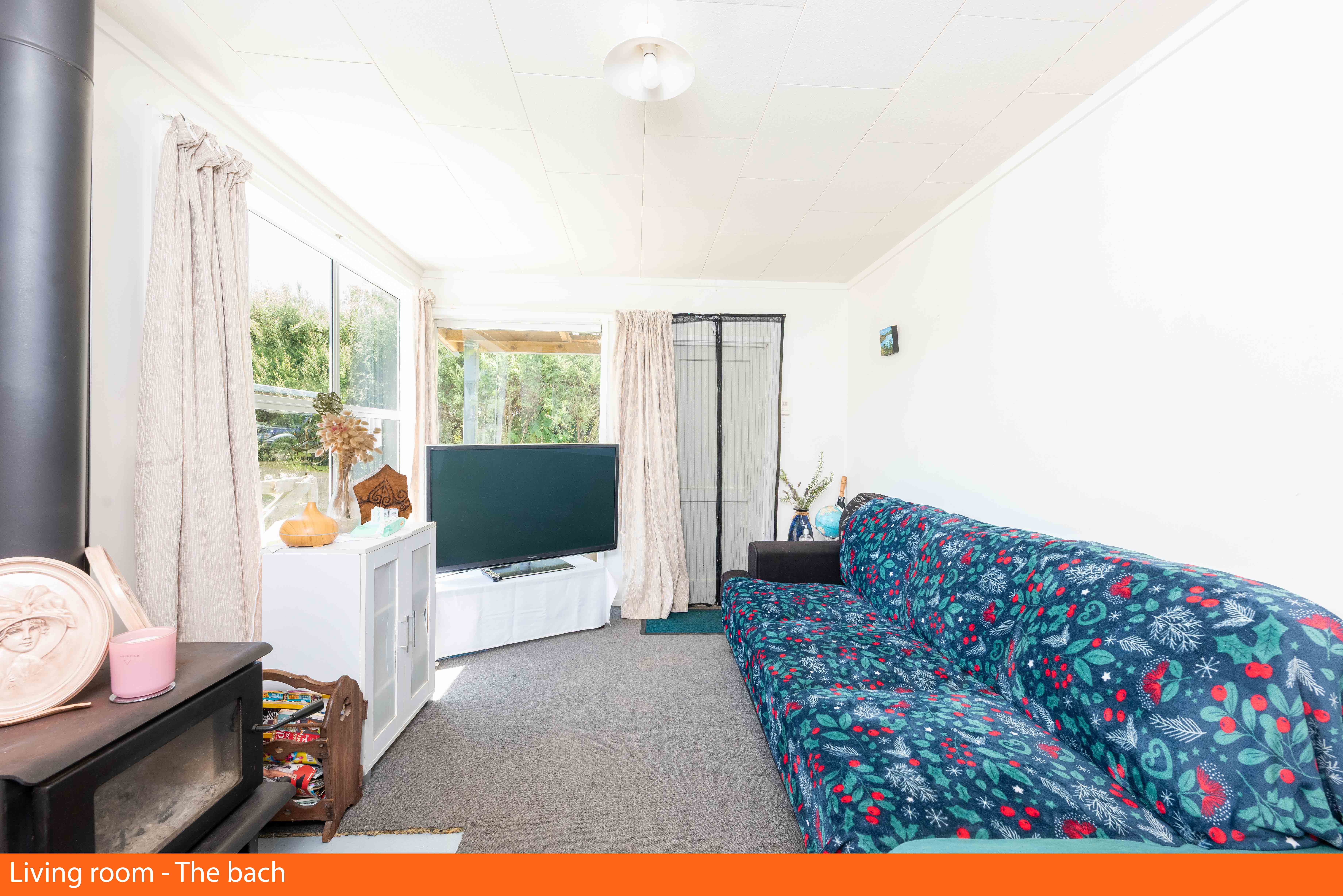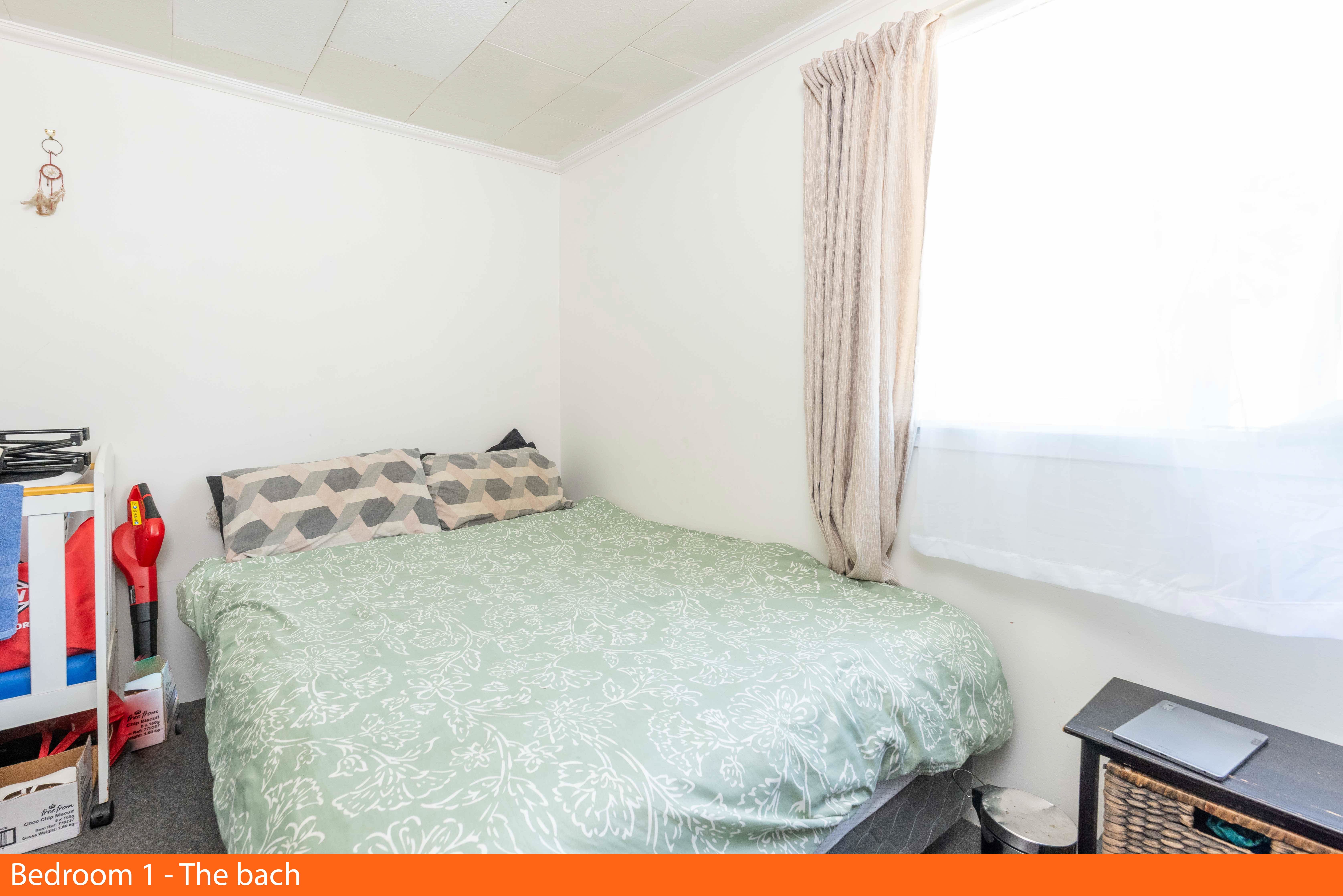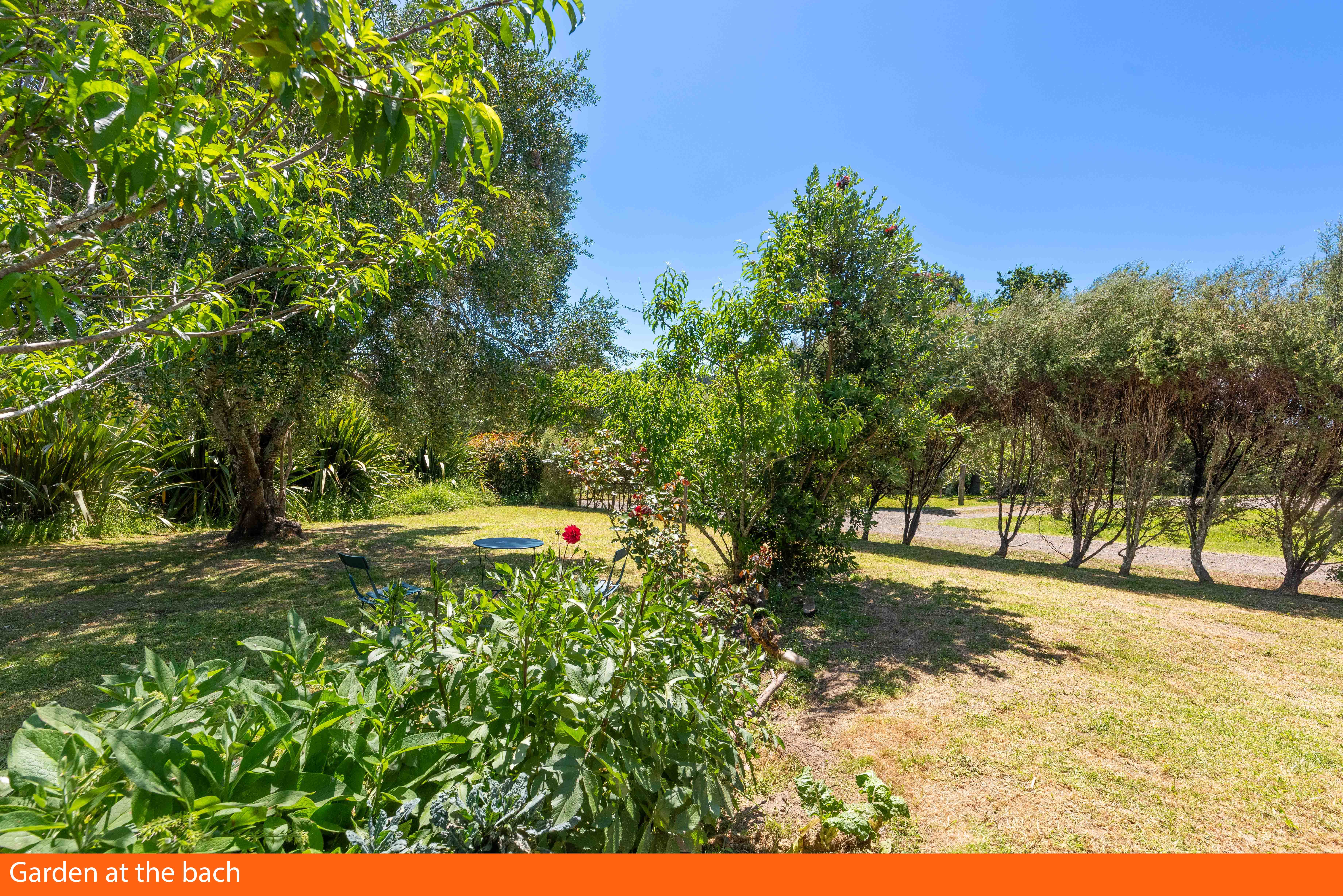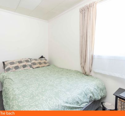 The bach provides a two-bedroom, one-bathroom option, ideal for guests or supplementary accommodation. A total of 129,000 litres of rainwater storage capacity is available.