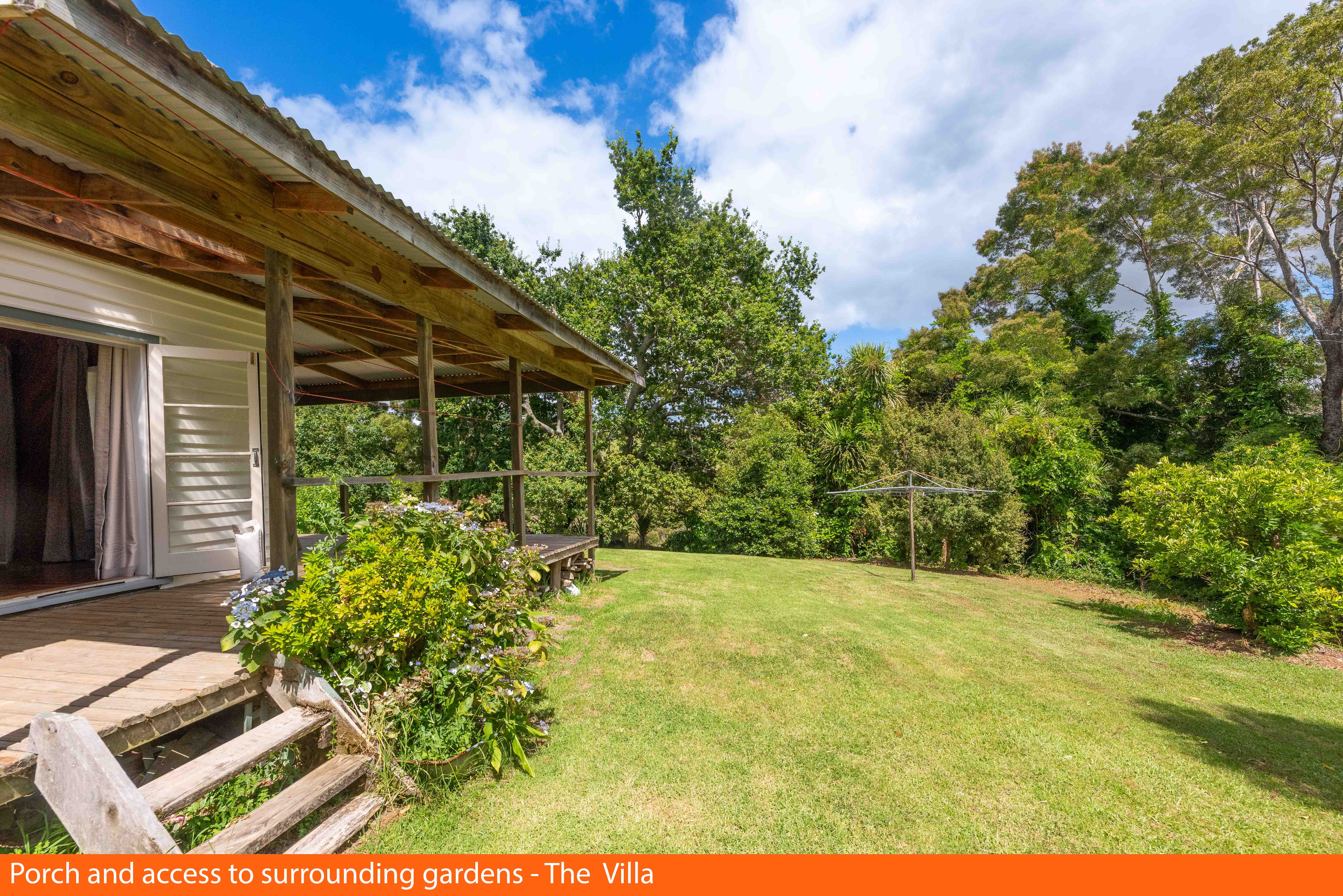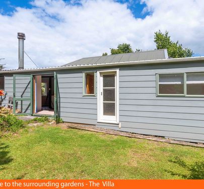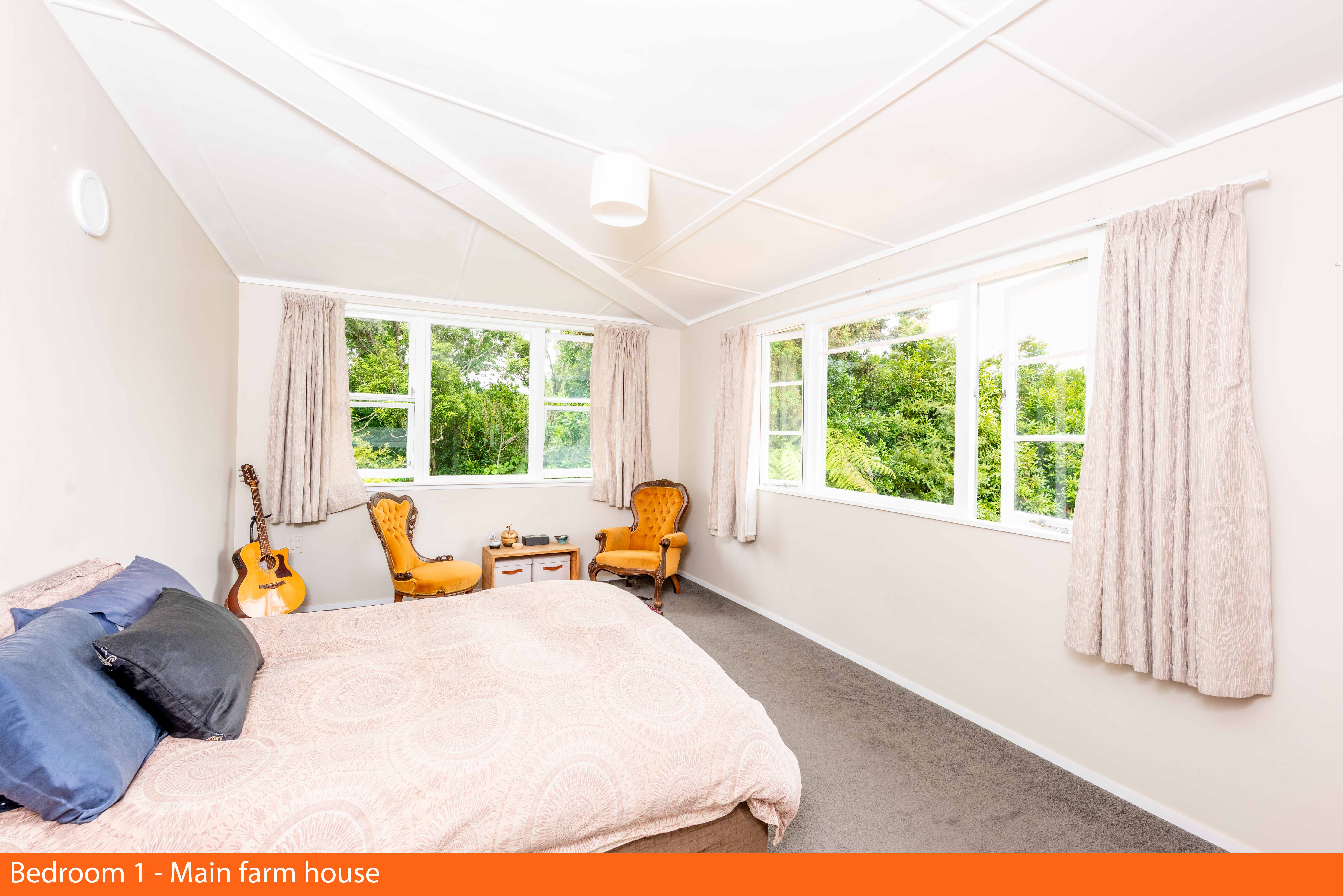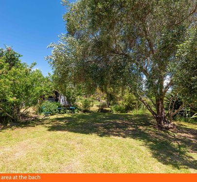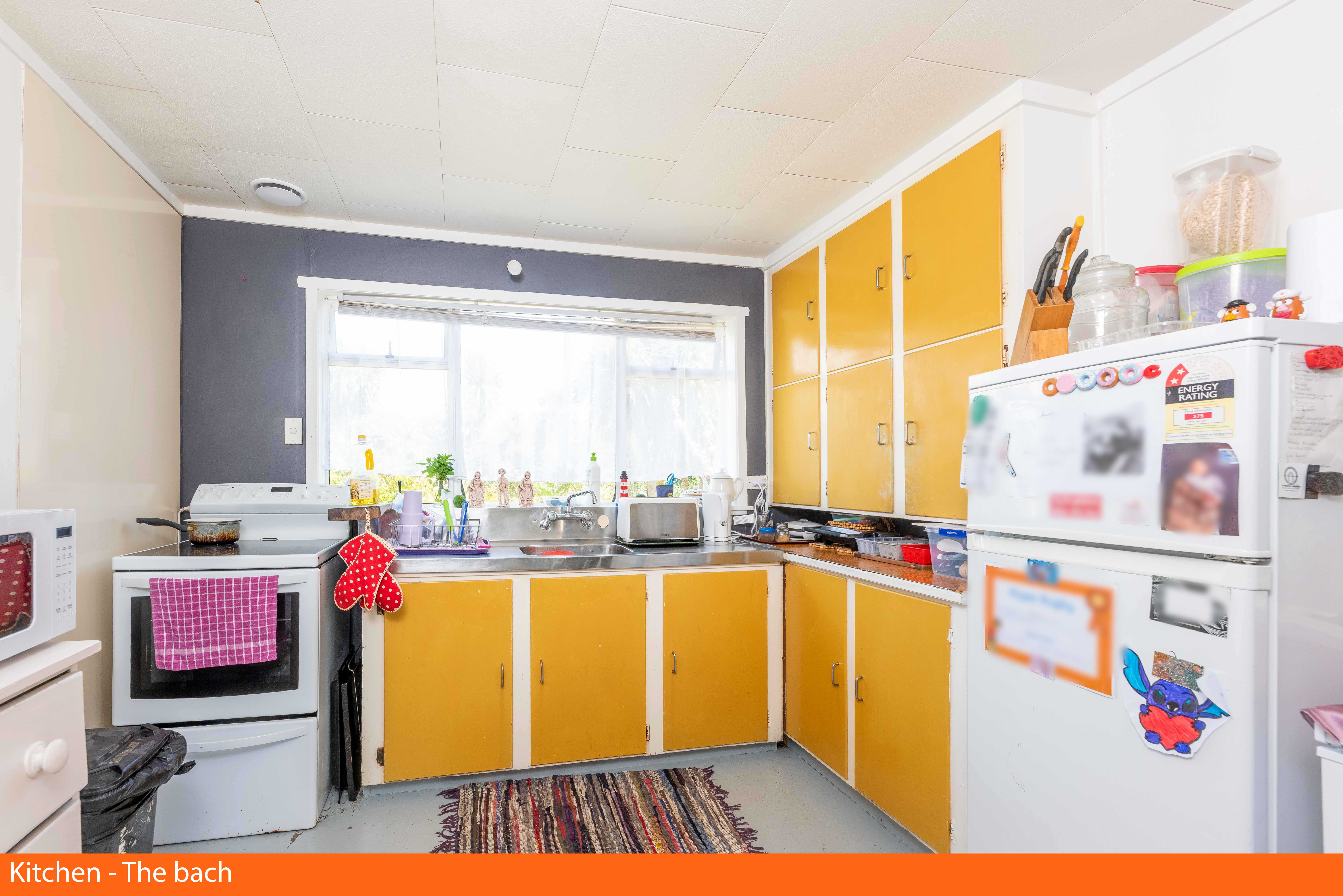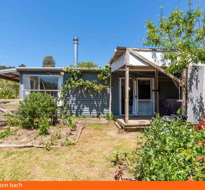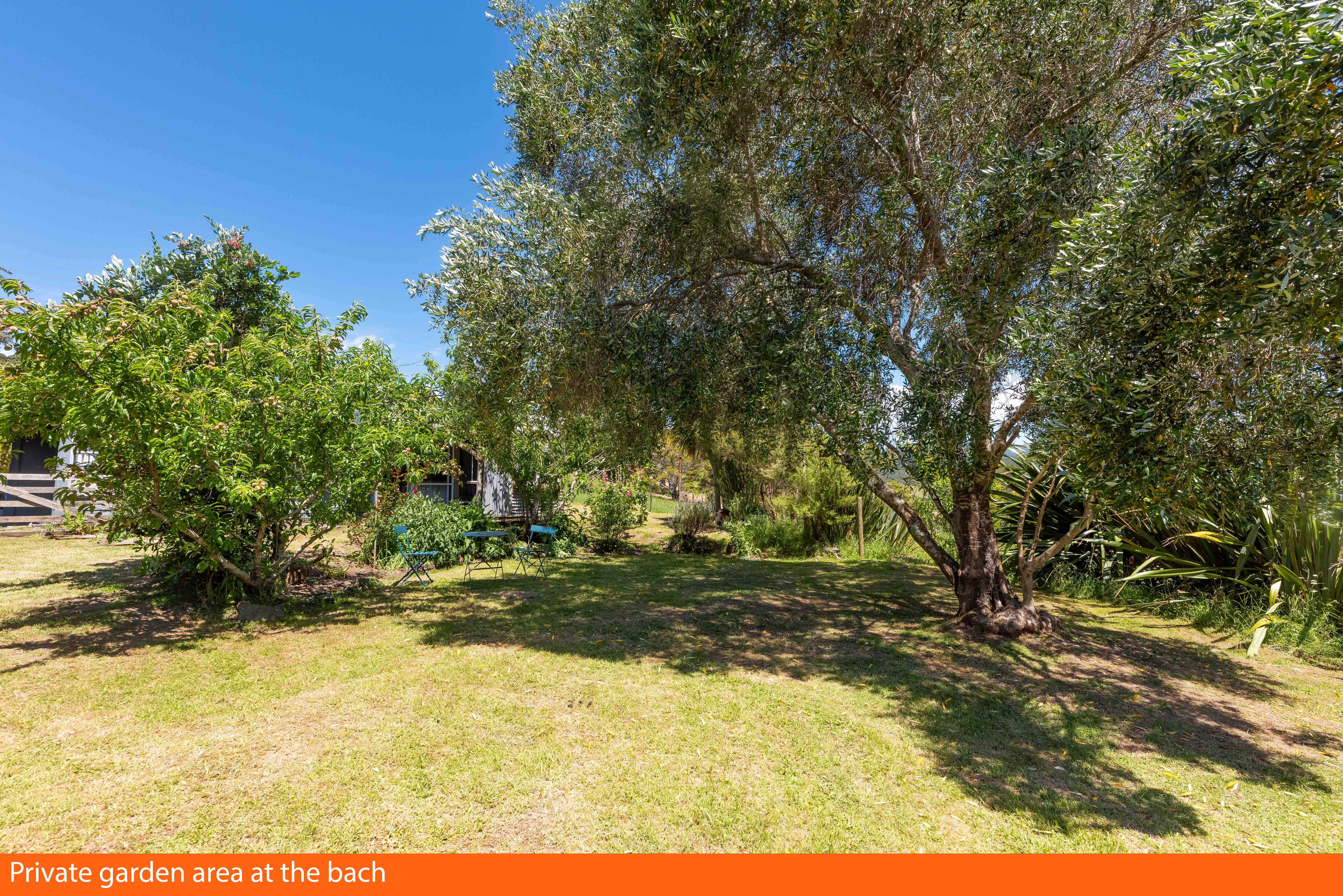 The bach provides a two-bedroom, one-bathroom option, ideal for guests or supplementary accommodation. A total of 129,000 litres of rainwater storage capacity is available.