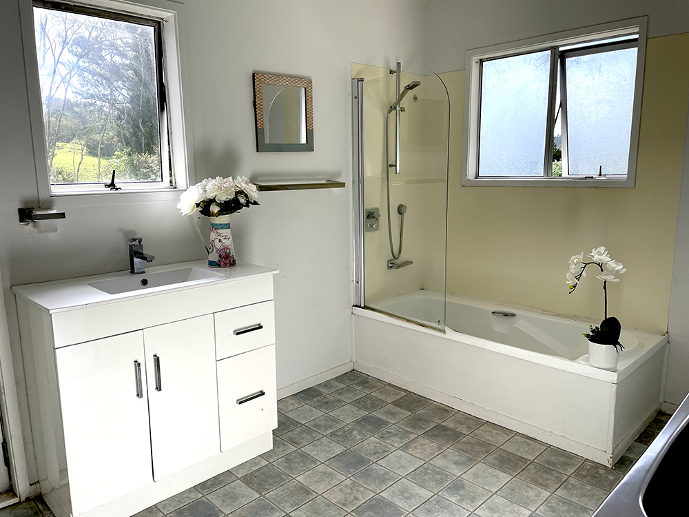 House is elevated on high ground with a grazing paddock and chicken coop. 1980s home was